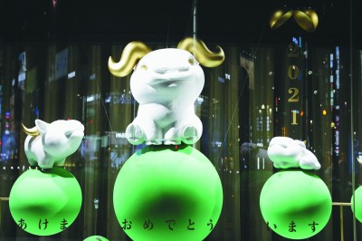 1月1日在日本东京银座拍摄的一家商场的橱窗,里面展示着“2021”字样和“牛”的形象。当日,日本东京街头展示各类“2021”字样庆祝新年。新华社发