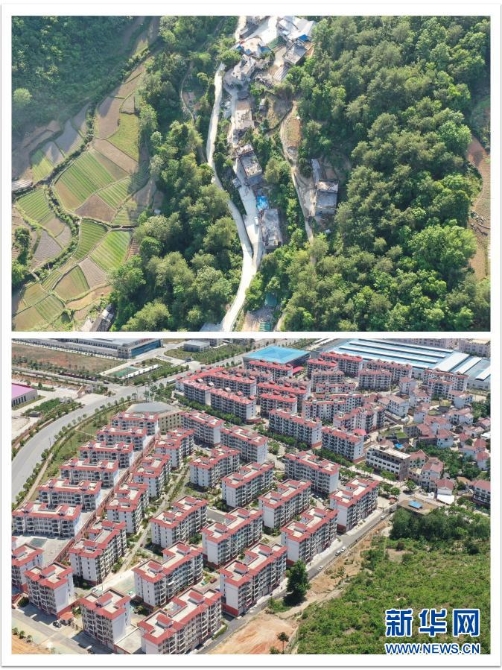 拼版照片,上图为:贵州惠水县摆金镇斗底村一角(无人机照片,2020年5月6日摄);下图为:斗底村村民搬迁之后居住的惠水县明田街道新民社区一角(无人机照片,2020年5月6日摄)。新华社记者 欧东衢 摄