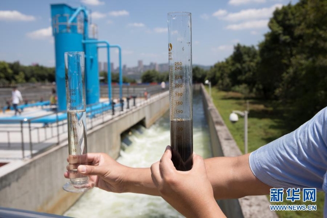 一名工作人员在重庆市南岸区鸡冠石污水处理厂出水口比较污水和出水的不同水质(2018年7月28日摄)。重庆市南岸区鸡冠石污水处理厂位于长江南岸,在保护长江环境中扮演着重要角色。新华社记者 金立旺 摄
