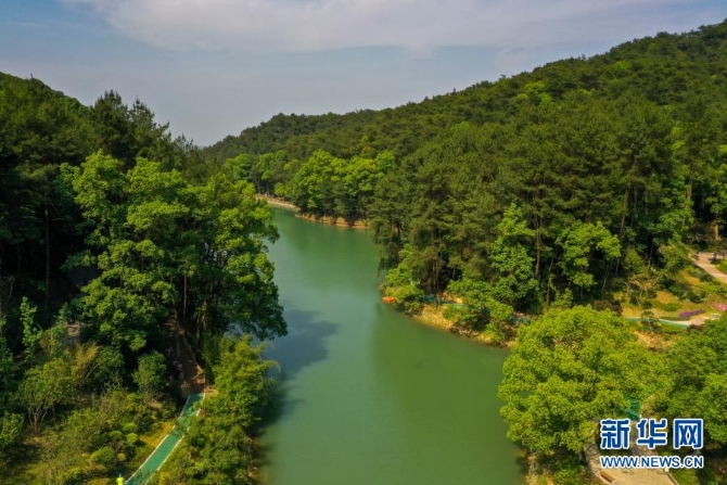 这是2020年5月18日拍摄的经过生态修复后景色迷人的重庆缙云山国家级自然保护区黛湖(无人机照片)。新华社记者 刘潺 摄