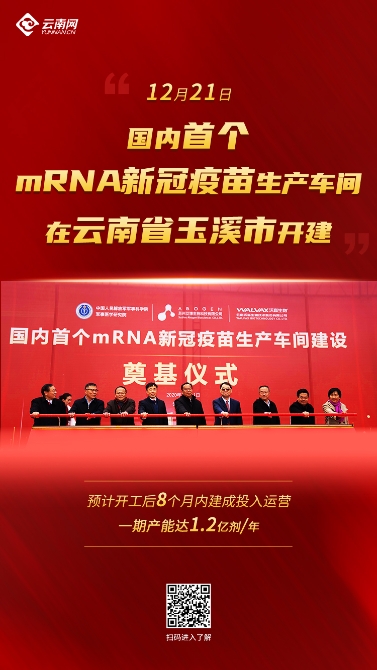 2020年12月21日,国内首个mRNA新冠疫苗生产车间奠基仪式在云南省玉溪市高新区疫苗产业园举行,预计开工后8个月内将建成投入运营,一期产能为1.2亿剂/年。