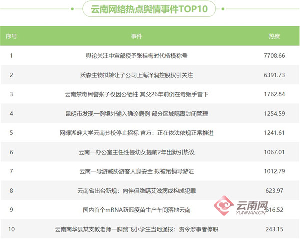 2020年12月“云南网络热点舆情事件TOP10”榜单上,“中宣部授予张桂梅时代楷模称号”相关舆情热度最高,舆论场致敬时代楷模张桂梅成为主流声音,在全国营造了学习张桂梅精神的浓烈氛围,重塑了时代榜样的力量。“沃森生物拟转让子公司上海泽润控股权”“云南禁毒民警张子权因公牺牲 其父26年前倒在毒贩手雷下”分别排在第二、第三。此外,云南省出台新规称向伴侣隐瞒艾滋病将构成犯罪、云南一导游威胁游客拟被吊销导游证、昆明市发现一例境外输入确诊病例部分区域隔离封闭管理等事件都见诸榜上。