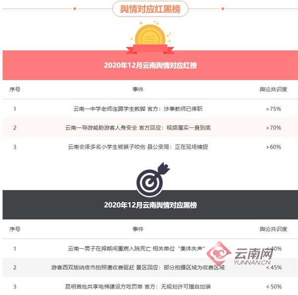 1月5日,云南网推出2020年12月“云南舆情地图”,对12月云南热点事件、主题报道、涉事领域分布、舆情应对红黑榜等进行梳理盘点。