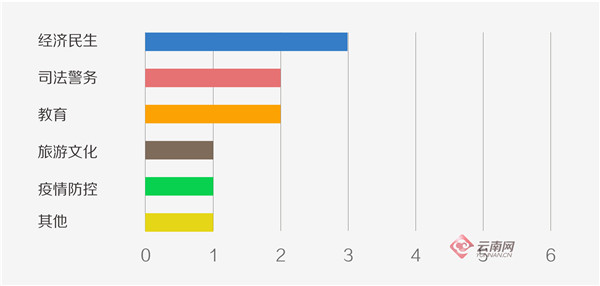 从舆情涉事领域来看,经济民生3起,司法警务、教育均为2起,旅游文化、疫情防控、其他均为1起。(云南网 记者许芸翡)