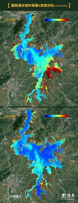 ▲图为鄱阳湖水域叶绿素a浓度2016年与2020年对比图。卫星数据分析:大地量子