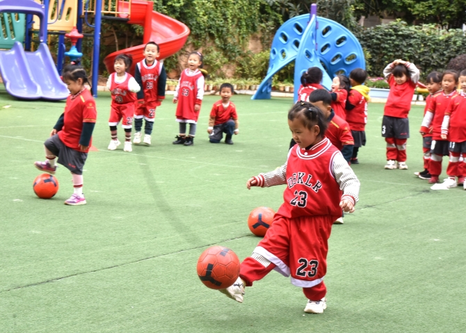 张瑶表示,开展足球活动首先是普及,抓住3至6岁幼儿的运动兴趣、习惯、认知和技能产生发展的关键期,尊重规律,以游戏、兴趣为主,广泛开展幼儿足球活动。枫林盛景幼儿园与云南志航体育进行合作,由他们派驻专业的教练,利用体能课、课间操等时间对所有的孩子进行足球基础教学活动,培养孩子们的兴趣爱好。同时,挑选大、中班比较优秀的学生成立由8~9人组成的足球代表队,利用课余时间训练,并参加各类比赛。同时,幼儿园要求老师不仅要进行学习足球的相关知识,还要应用到实际教学活动中,一起和教练磨课,研课,设计出了符合幼儿身心特点的足球活动,营造浓厚的足球文化。