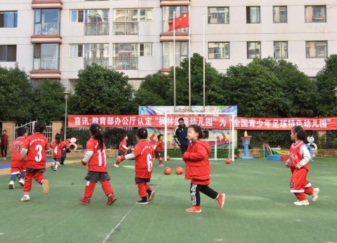 枫林盛景幼儿园园长张瑶介绍,从2018年开始,幼儿园合理利用室内外环境,创设开放的、多样的区域活动空间,为幼儿提供有利于激发学习探索、安全、丰富、适宜的足球游戏材料和教具。并引进社会资源开展以游戏为本来发展兴趣、展现童趣、锻炼身体机能,培养幼儿互动合作精神的足球教学,同时开展足球文化建设,通过板报,讲故事等形式传播足球知识,球星事迹和知名俱乐部历史与现状。孩子在与足球紧密相关的玩乐中茁壮成长,培养了近百名孩子对足球的兴趣。