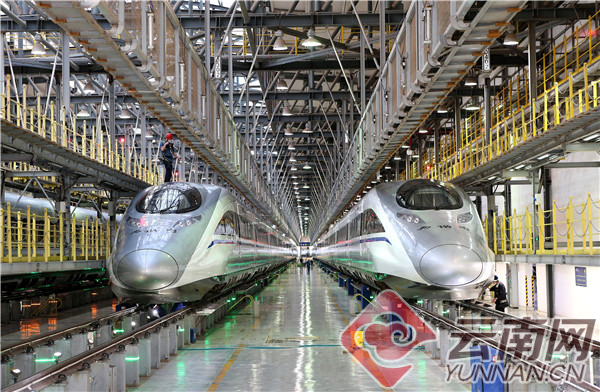 地勤机械师正在对入库动车组列车进行外观状态检查 记者 雷桐苏 摄