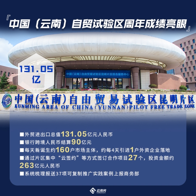 2019年8月30日,中国(云南)自由贸易试验区挂牌成立,昆明、红河、德宏三片区同时挂牌。设立一年以来,云南自贸试验区以开放、创新、自由、便利的“自贸思维”作为核心,大胆闯、大胆试、自主改,着力打造“一带一路”和长江经济带互联互通的重要通道,建设连接南亚东南亚大通道的重要节点,推动形成我国面向南亚东南亚辐射中心、开放前沿。