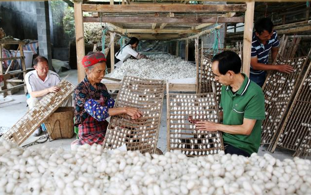 △2020年9月11日,重庆市黔江区杉岭乡林峰社区第一书记杜建(前右)和村民一起采摘蚕茧。