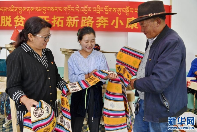 2020年7月6日,西藏扎囊县吉汝乡扎西林村驻村工作队队长央珍(左)、党支部书记旺扎(右)和专业合作社社员次旺曲珍查看民族手工业(邦典)质量。 新华社记者 张汝锋 摄
