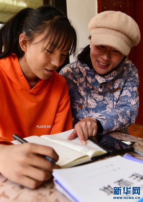 2020年3月26日,在西藏林芝市朗县扎西塘村的一户建档立卡贫困户家中,西藏林芝市委宣传部驻村工作队员何晓雪(右)正在为学生辅导功课。 新华社发(索朗罗布 摄)