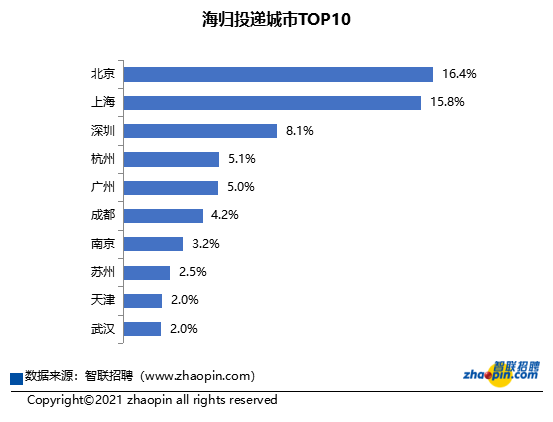 智联招聘数据显示,2020年,向国内岗位投递简历、即有意在国内发展的海归人才数量,较2019年猛增33.9%,增幅远高于2019年(5.3%)、2018年(4.3%)的同比增幅。