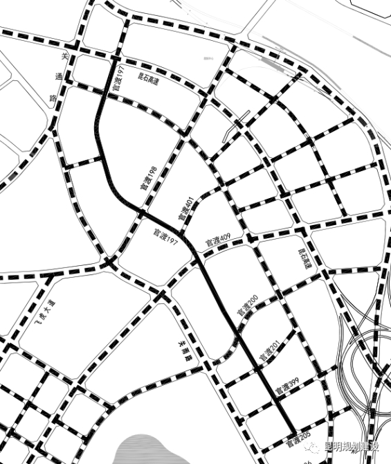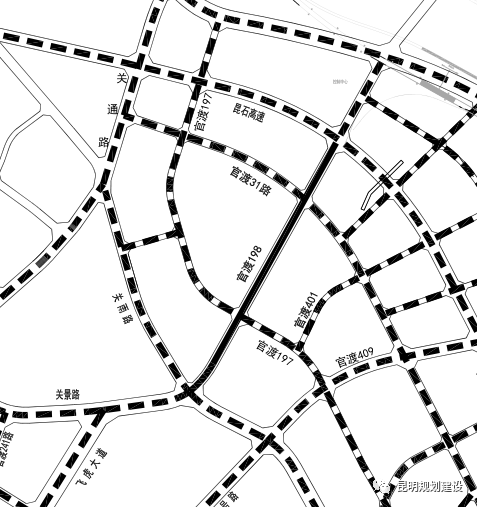 官渡198路:道路起于关雨路交叉口,止于官渡31号路交叉口,道路红线宽度30m,设计车速40km/h,道路长度756.696m。