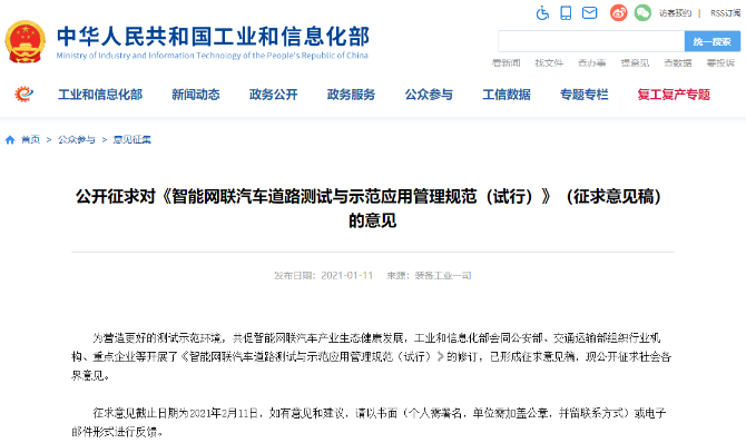 1月11日,工信部装备工业一司发布公告显示,工业和信息化部会同公安部、交通运输部组织行业机构、重点企业等开展了《智能网联汽车道路测试与示范应用管理规范(试行)》的修订,已形成征求意见稿,现公开征求社会各界意见。征求意见截止日期为2021年2月11日,如有意见和建议,可通过书面(个人需署名,单位需加盖公章,并留联系方式)或电子邮件形式进行反馈。