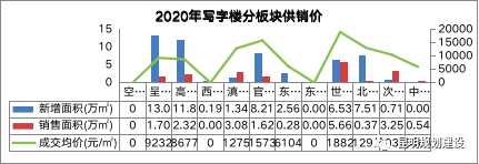 2020年办公市场官南、呈贡和东南板块供应量最多,呈贡、高新、官南板块成交量较高,呈贡、东南和官南板块存量面积最大,世博板块去化周期最长。