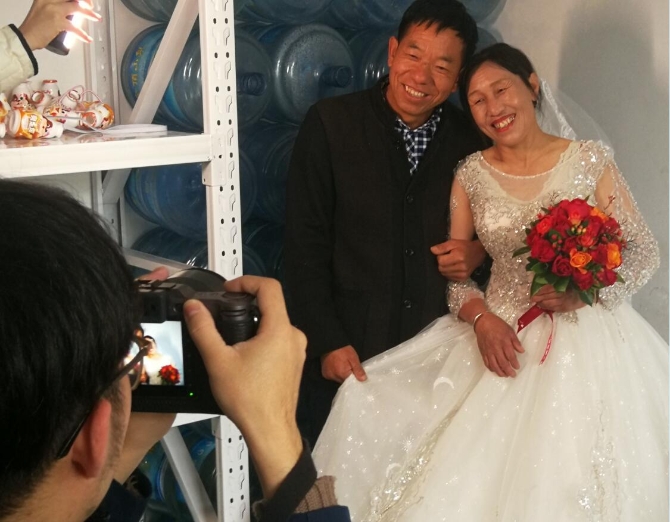拍摄现场,高琼仙害羞地接受着志愿者们的化妆,并穿上了专门为她定制赠送的婚纱、头饰、红鞋。听着老伴杨忠华念着蔡崇信公益基金会专门设计制作的520明信片上,一个个阿里巴巴志愿者写上的祝福语,高琼仙脸上洋溢着幸福的笑容,自言自语地重复一句话:“嫁给老师对,嫁给杨老师真好!”