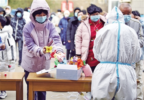 在石家庄市长安区广安街道名门华都社区,医护人员两人一组,一人负责扫描证件、另一人则熟练地进行咽拭子采样,整个过程仅需几十秒。在现场,医护人员还收到不少小朋友送上的手工折花祝福。