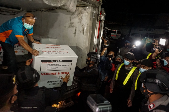1月5日凌晨,在印度尼西亚巴厘省登巴萨市,人们搬运刚刚运抵的新冠疫苗。自1月4日起,印尼卫生部开始向全国34个省级行政区分发由中国科兴公司研制的新冠疫苗。新华社发(比兴拉辛摄)