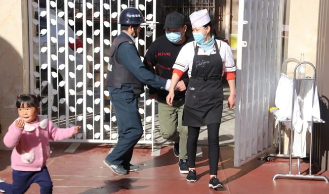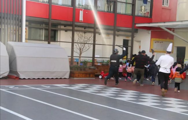 整个演练分两个场景进行。 第一个场景由一名教师扮演“暴徒”透过幼儿园围栏向幼儿园泼洒不明液体。保安拉响警报、迅速报警、启动预案。听到警报声,户外活动的老师迅速带领小朋友们到安全地方躲起来,防止“暴徒”的突然袭击。第二个场景,一名教师扮演“歹徒”,趁食堂工作人员出去丢垃圾的时候,尾随其后混入校园行凶。保安拉响警报、迅速报警、启动预案。各班教师迅速带领幼儿撤离到就近班级,将门窗紧闭,并顶住教室门,防止暴恐分子破门而入。然后清点幼儿人数,保护好每个孩子的生命安全。面对危险的“歹徒”,安保人员勇往直前,一路猛追,并用钢叉、盾牌、警棍等防卫、攻击,与歹徒殊死搏斗,最终将“歹徒”制服。