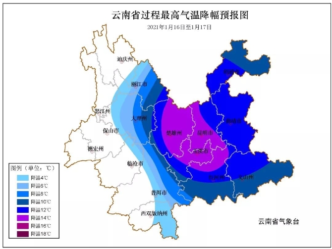 昆明信息港讯 记者李丽朱 据中国天气网消息,受强冷空气和西南暖湿气流共同影响,预计1月16日至17日,滇东、滇中、滇南地区将先后出现强降温,最高气温将普遍下降8至10℃,局地下降12至14℃。其中,16日,昆明多云转雨夹雪,气温在2至15℃,17日,昆明阴有小雪,气温在-1至2℃。
