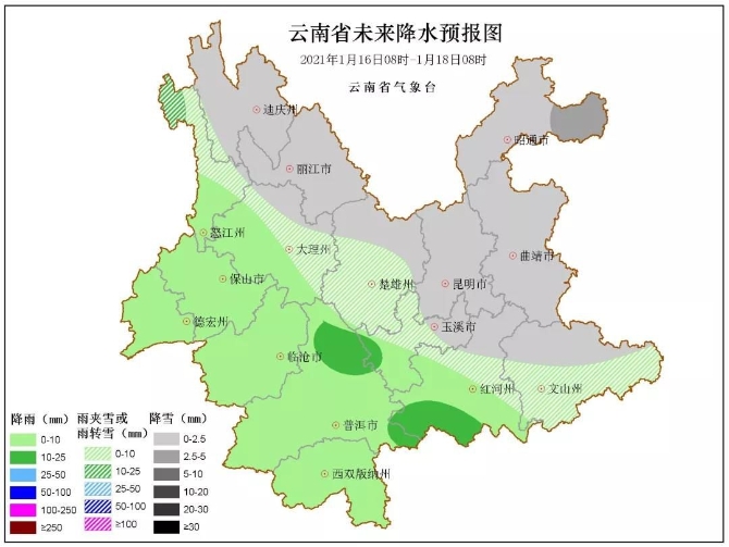 17日08时至18日08时:昭通、曲靖、文山、红河北部、玉溪北部、昆明、楚雄、大理东部和北部、丽江、迪庆、怒江北部阴有雨夹雪或小雪局部中雪,其它地区阴有小雨局部中雨。