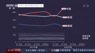 繁忙的港口,进进出出的国际航船,是中国外贸强劲复苏的缩影。这张图描绘的是世界主要经济体的外贸景气度。国家信息中心大数据显示,2019年期间,中国的外贸景气度逐渐加大,世界贸易枢纽的位置更加明显。不过到了2020年第一季度,疫情让它突然暗淡下来,一度被美国反超。