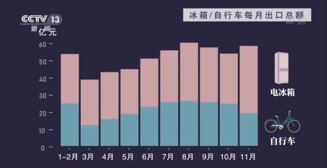 从这张反映出口额的走势图上,就能感受到它们的火爆程度。光是2020年11月一个月,中国自行车出口额同比增长了98.7%,冰箱则是82.4%。
