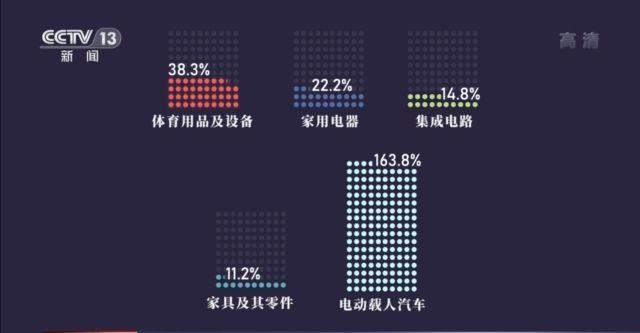 在健康生活和宅经济的带动下,小到体育用品、家用电器、集成电路;大到家具、电动载人汽车的海外销量也是一路上扬。