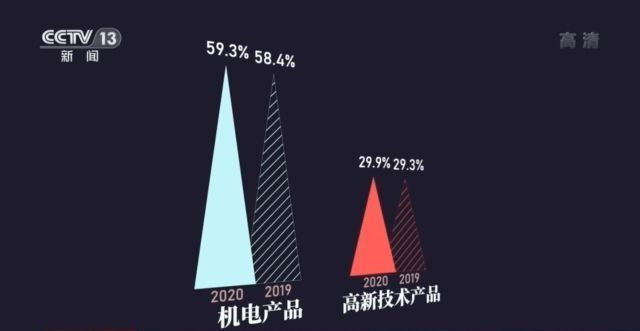 2020年前11个月,机电产品平均出口份额59.3%,高技术产品出口份额29.9%,这些技术密集型产品所占份额,比2019年同期进一步提高。
