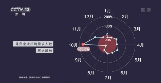 逆势上扬的外贸活动,进一步带动了人才需求。国家信息中心抓取全网主要招聘信息后分析发现,从2020年9月起,外贸企业招聘由降转增,10月招聘需求人数猛增163.6%。