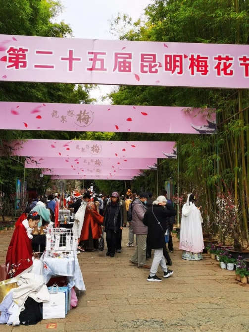 昆明信息港讯 记者杨雁 1月16日,首届梅花汉服节在黑龙潭公园举行,近500名汉服爱好者入园游览、赏梅,传承中华汉文化,当天下午的汉服巡游更让公园内的游客共同体验了一次时光穿越。