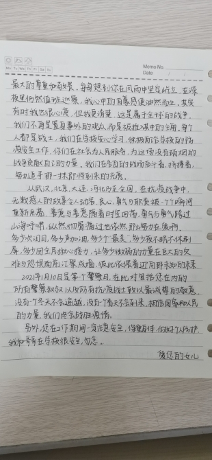 在这封写给“警察叔叔”的信的结尾,女儿张佳琪写到:“没有一个冬天不会逾越,没有一个春天不会到来,相信国家的力量,我们终会战胜疫情”。