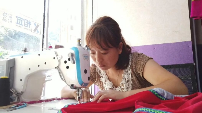 李花妹:我们一家人搬到这里后,来服装厂做工。在这里工作比较轻松又不被雨淋太阳晒,还能挣点钱。