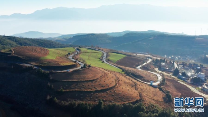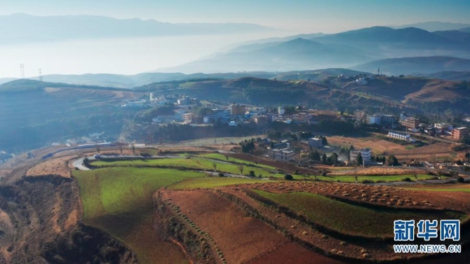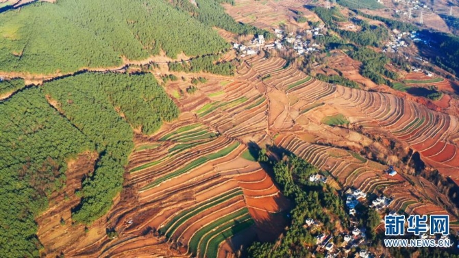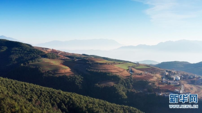 红土地景区隶属东川区红土地镇,距昆明市160公里,距东川城区40公里,是云南红土高原上极具典型和特色的红土地,荟萃云南红土高原迷人的色彩、线条及光影,被誉为“大地刺绣的精品,农耕文化的杰作”。(新华网 刘东摄影报道)