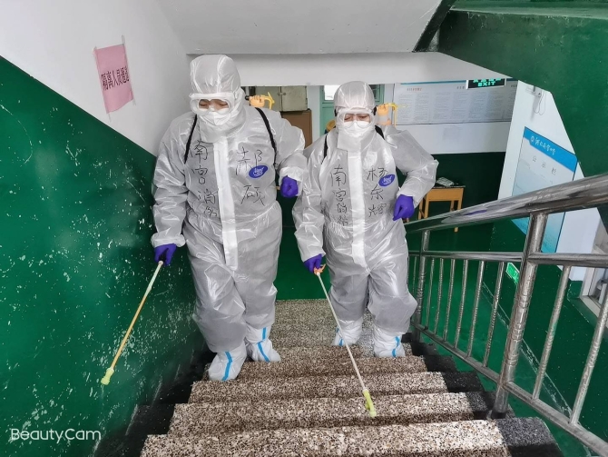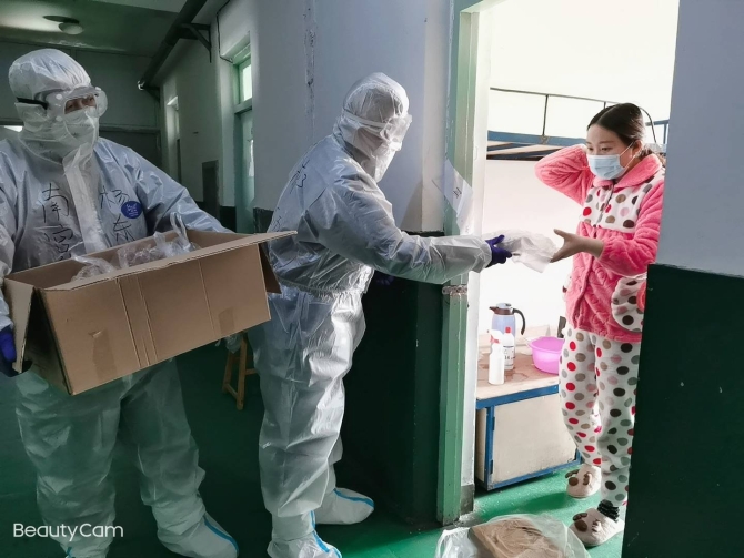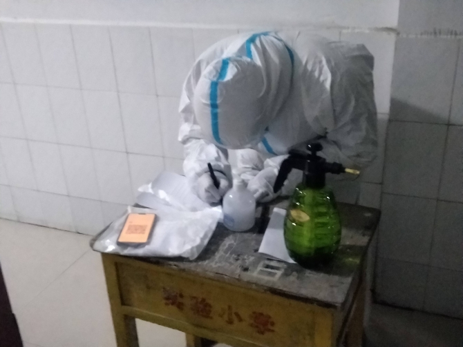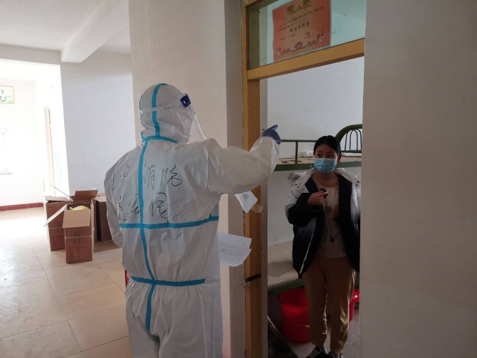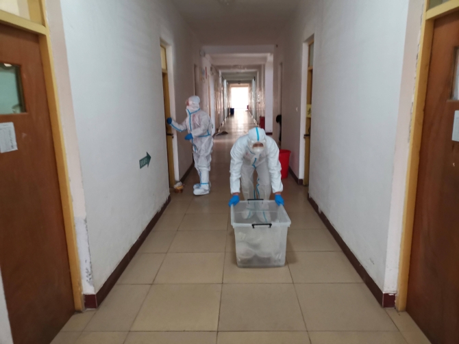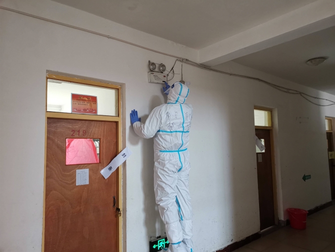 9:00-11:00,在这个时间段,大家各司其责,消杀、测量体温、配送药品、清理各类物资,利用宿舍楼层广播系统播放防疫和消防安全注意事项。大家有条不紊地开展工作,做好个人防护与消毒,没有人恐慌,也没有人害怕……