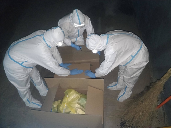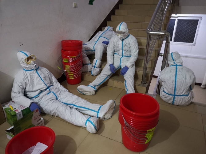 19:00-21:00,暮色降临,晚饭结束。终于完成一天的任务!脱下防护服的他们,脸上露出了欣慰的笑容。本想着脱下湿透的衣服,洗个手,喘口气儿,跟孩子视个频……但工作并没有就此结束……