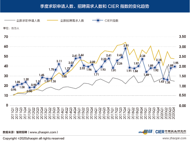 近日,中国人民大学中国就业研究所与中国领先的职业发展平台智联招聘,联合发布2020年第四季度《中国就业市场景气报告》,其中指出,四季度就业市场景气指数(CIER)为1.95,高于一季度的1.43、二季度的1.35和三季度的1.89,就业市场呈现持续回暖态势。