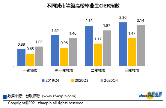 近日,中国人民大学中国就业研究所与智联招聘联合发布《2020年第四季度应届生就业市场景气报告》,其中指出,本季度高校毕业生就业市场景气指数(CIER)同比和环比均出现上升。当年全年,昆明、宁波、南宁的求职投递涨幅,均超过了65%。