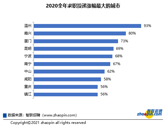 2020年求职投递涨幅最大的主要是新一线和二线城市,并且大部分为南方城市。具体来看,温州、嘉兴、厦门求职投递涨幅最高,分别为93%、80%和73%。此外,昆明、宁波、南宁的求职投递涨幅也超过了65%。