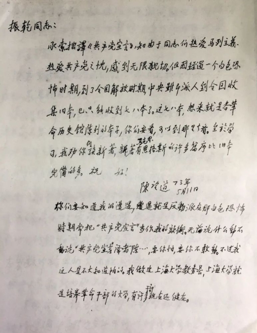 这是陈望道写给郑振乾的信件(资料照片),他在信中写道:“你们要知道我的遭遇,遭遇就是反动派在那白色恐怖时期常把‘共产党宣言’当作我的头衔……要你怕,要你不敢动。不过我这人是不大知道怕的。” 新华社发