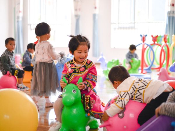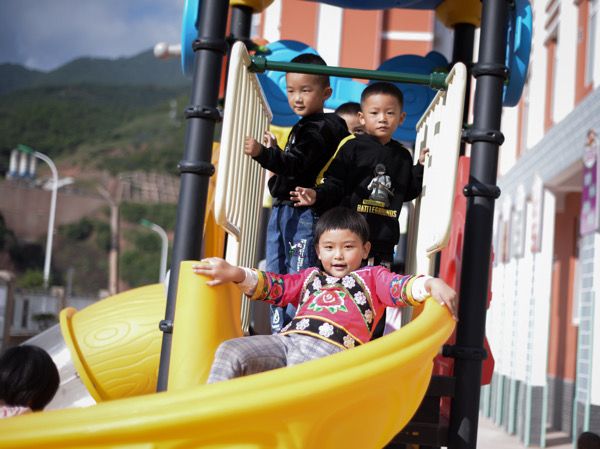 社区幼儿园的操场上,穿着不同民族服饰的老师和孩子们在欢快地同跳着一支民族舞;老人们在社区的凉亭里聊天唠嗑。