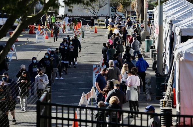 1月6日,在美国加州洛杉矶的一处新冠病毒检测站,民众排队等待检测。新华社发