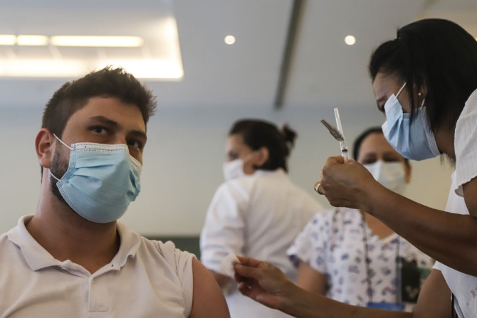 1月19日,在巴西圣保罗,一名医务人员接种中国新冠疫苗。新冠疫情持续蔓延,中国新冠疫苗为许多国家和地区抗击疫情提供助力、注入信心。新华社发(拉赫尔·帕特拉索摄)