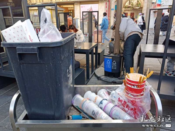 朱大爷每天用在垃圾分类上的时间不是小数,多数都是食品包装。这是商业街地段情况。