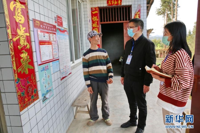 纪检监察干部向四川洪雅县中山镇邹岗村建档立卡贫困户杨德彬(左一)核实产业扶贫资金落实情况(2020年3月18日摄)。新华社记者 江宏景 摄