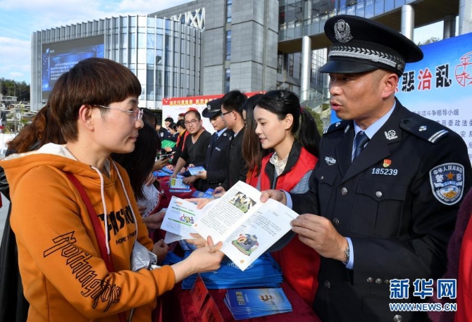 福建省福州市永泰县公安干警在扫黑除恶专项斗争宣传活动上向群众介绍专项斗争成果(2020年1月6日摄)。新华社记者 张国俊 摄