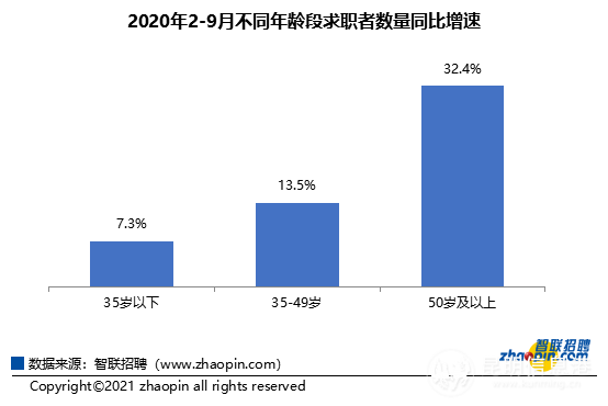 报告揭示,2020年2-9月在智联平台投递简历的35岁及以上求职者同比增长14.9%,而35岁以下求职者同比增长仅为7.3%;其中,35-49岁中高龄求职者同比增长13.5%,50岁及以上中高龄求职者同比增长32.4%。根据问卷调查,疫情期间因单位倒闭、停产或歇业导致的中高龄劳动者再就业的比重为25.3%,新冠肺炎疫情是前三季度中高龄求职者规模高于往年的最主要外生变量。