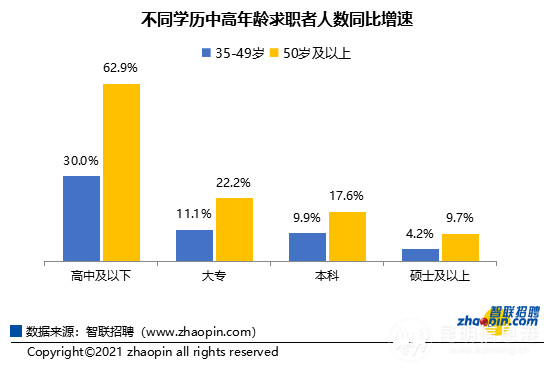 智联招聘近日发布《中高龄求职者就业问题研究报告》,其中指出,我国就业市场在新冠肺炎疫情冲击下保持平稳,但不同年龄的劳动力群体间出现结构性分化,更多中高龄求职者进入再就业市场,35岁及以上求职者同比增长14.9%,低学历中高龄人群面临的再就业压力更大,男性中高龄人群再就业压力大于女性。