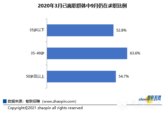 2020年3月已离职的35岁及以上求职群体中,到9月份仍有62.9%继续在智联平台投递简历,失业时间超过半年。其中35-49岁和50岁及以上群体的比例,分别为63.6%和54.7%。